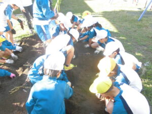 1学期に植え付け、今年の暑い夏を乗り越え、ようやく収穫の時を迎えたサツマイモ。毎日、用務員さんが水やりをしてくださり、夏休みの間は、地域の方が水やりをしてくださり、時々葉を動かして日のあたりを加減し、約半年の時を経て掘り起こしました。最初はなかなか出てこずに心配しましたが、そのうち鈴なりにイモが出てきて、子どもたちの大きな歓声があちこちで聞こえ始めました。