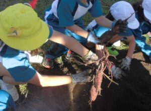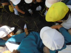 掘り起こした後は、しばらく日陰で追熟させ、焼き芋にしたり、給食に混ぜてもらったりして、おいしくいただく予定です。