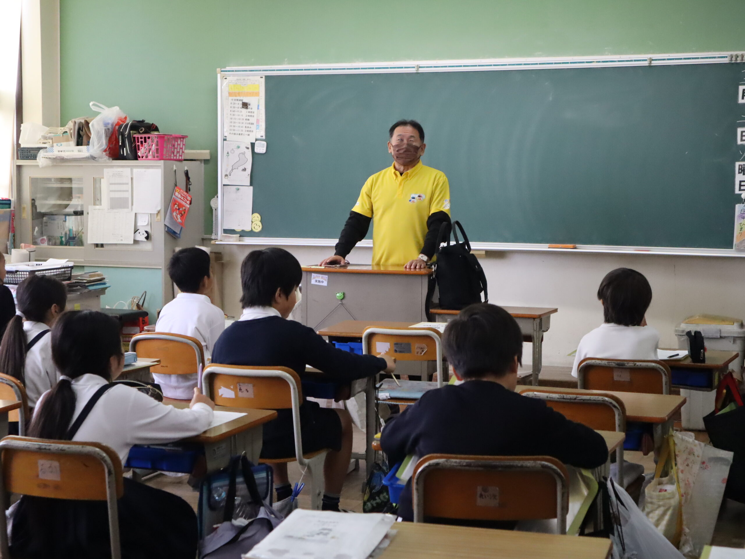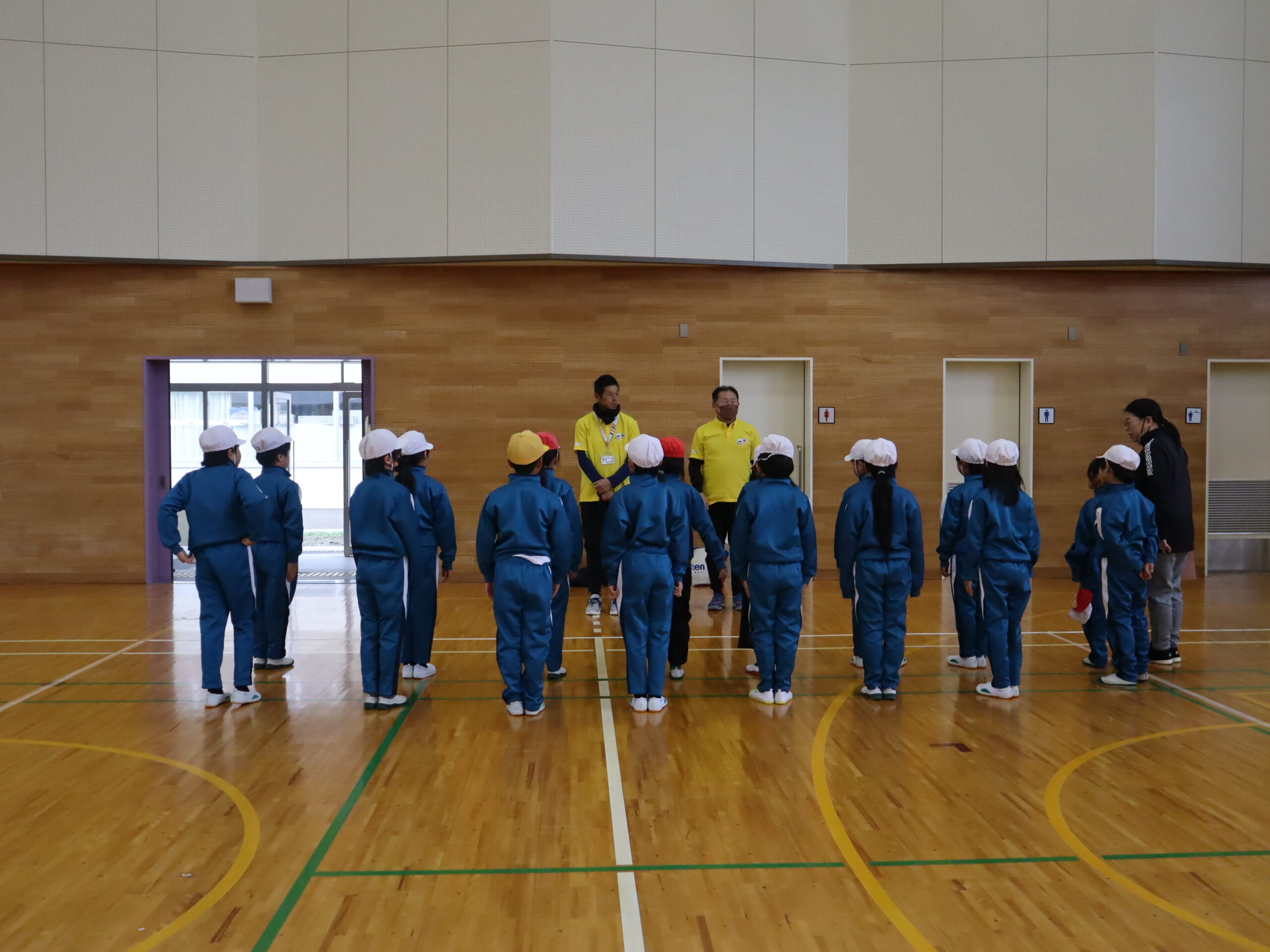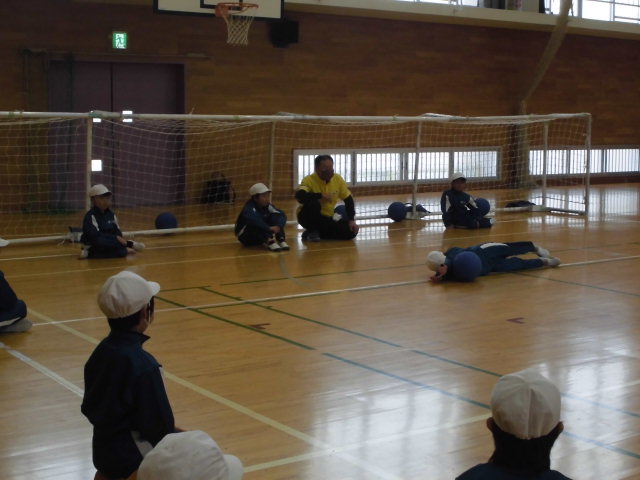 福祉体験学習を行うにあたり、滋賀県ゴールボール協会会長の西村秀樹さん、副会長の赤渕義誉さんに来校いただきました。まずは、体育館でゴールボールについてのお話をお聞きしました。