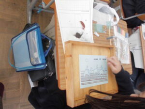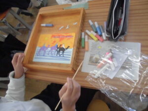 後半は教室で、原画をもとに砂絵制作の体験をしました、色付きの材料を混ぜて自分で色を作り着色して原画を完成させていきます。同じ原画でも、それぞれの児童の完成で、様々な色合いに着色され、作品の世界観がまったく違って見えました。