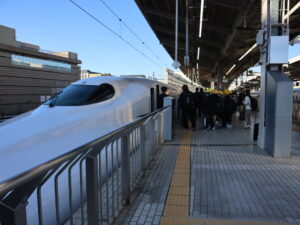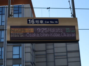 京都駅に到着後、9時25分発のぞみ9号博多行に乗車しました。N700系です。指定席の16号車は、最後尾でした。列に並んでスムーズに乗車できました。前方は、外国からの団体客でした。降りるときも同じで、広島で下車されました。