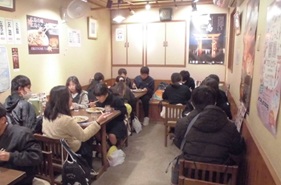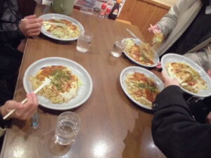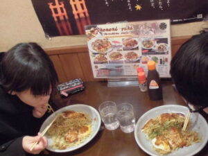 2日目の昼食は、宮島表参道商店街の中にある「くらわんか」で『広島焼き』を食べました。お好み焼きを食べるよ、と言っていたので、子どもたちの中では広島焼きを知らない子もいて、「先生、焼きそばが入ってるで。」とか「こっれてお好み焼き?いつものと違う。」という声が聞こえていました。